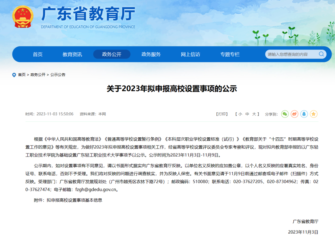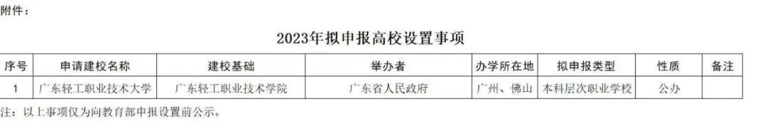 根据《中华人民共和国高等教育法》《普通高等学校设置暂行条例》《本科层次职业学校设置标准(试行)》《教育部关于“十四五”时期高等学校设置工作的意见》等有关规定,为做好2023年拟申报高校设置事项相关工作,经省高等学校设置评议委员会专家考察和评议,现对拟向教育部申报的以广东轻工职业技术学院为基础设置广东轻工职业技术大学事项予以公示。公示时间为2023年11月3日-11月9日。