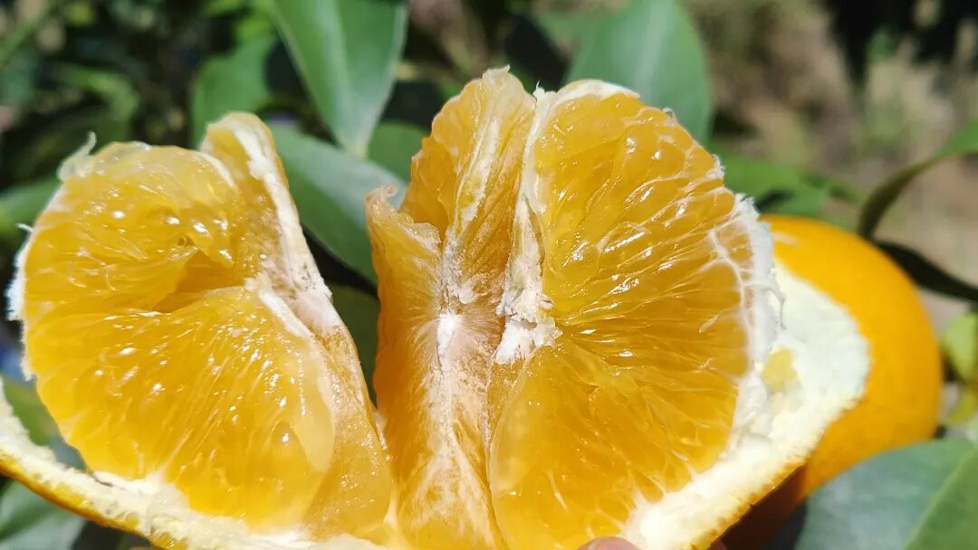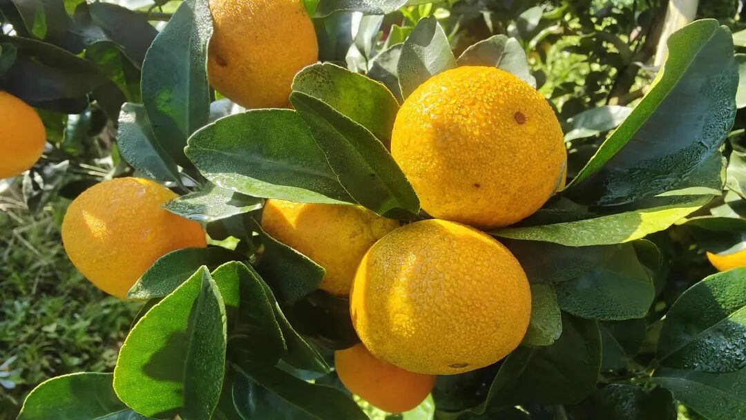 除了果冻橙之外,张志文还同时引种了砂糖橘新品种——金秋砂糖橘。记者看到,一棵棵砂糖橘的叶子都是青绿泛着亮光的,虽然树形不大,但结满了像葡萄一样一串串紧实抱团的果实,当地昼夜温差大,金秋砂糖橘表皮还裹满一层露水,晶莹透亮。据了解,金秋砂糖橘属于砂糖橘中的早熟品种,成熟之后果皮颜色为橙红色,含有丰富的维生素C,目前已经进入采摘上市的黄金期。