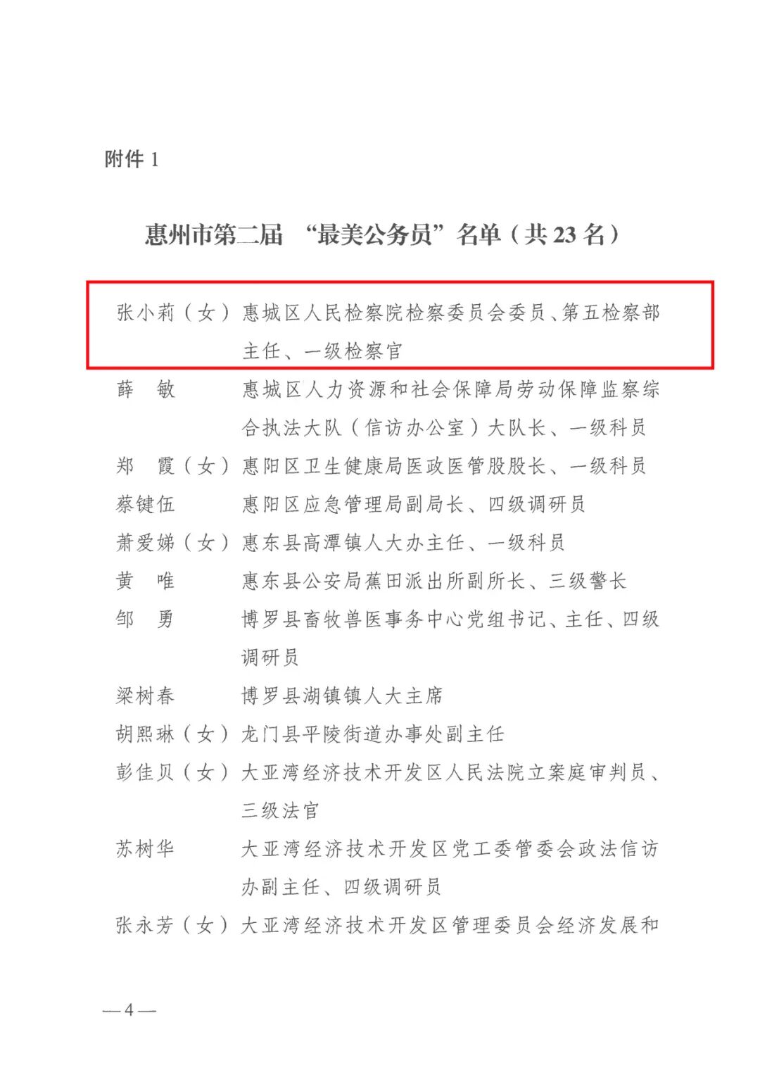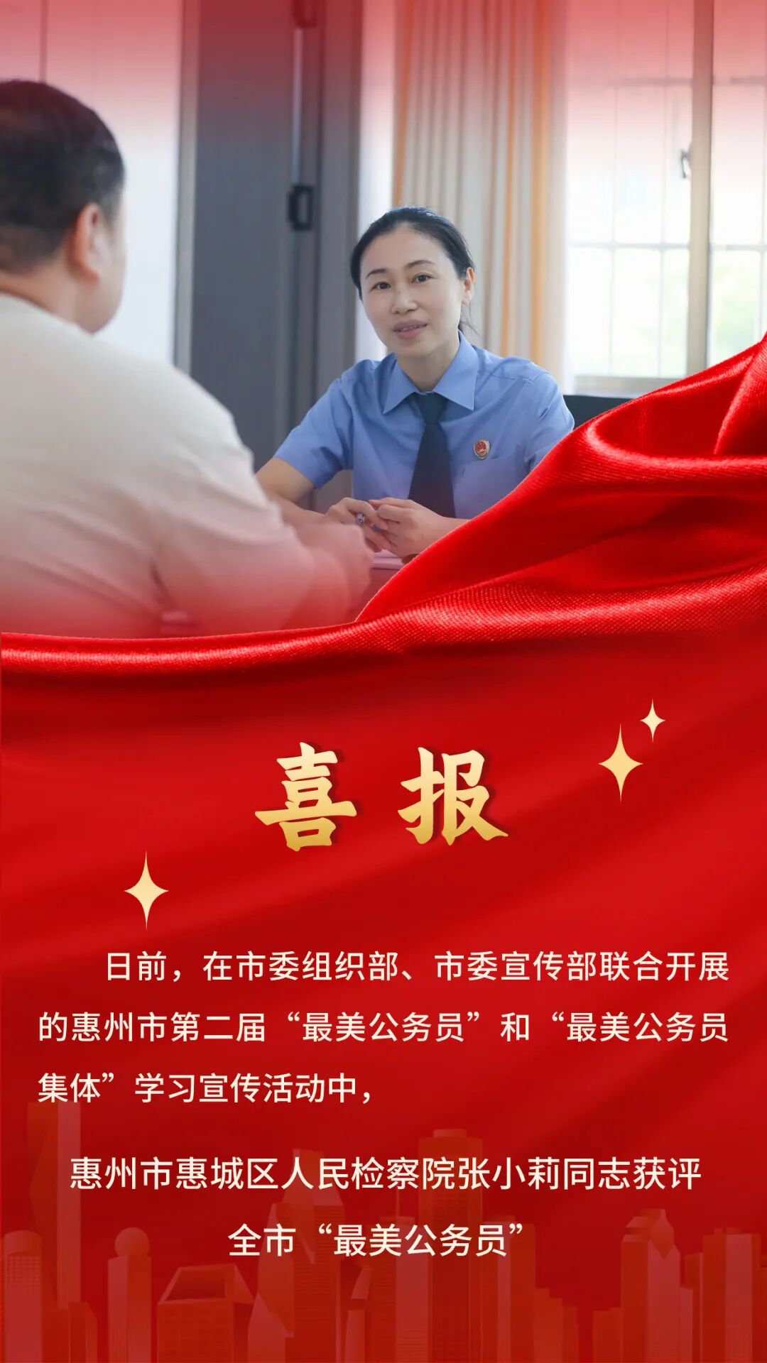 张小莉,现任惠州市惠城区人民检察院检察委员会委员、第五检察部主任、一级检察官、国家三级心理咨询师。张小莉同志坚持立足本职岗位,讲政治、顾大局、重品行、守纪律,勤奋务实、扎实履职,充分展现了青年干警敢于担当、勇于奉献的精神风貌,为惠城检察事业高质量发展作出了积极贡献。其负责未成年人检察工作期间,带领未检干警团结奋进,纵深推进犯罪预防工作、切实维护妇女儿童权益、打造未检普法品牌,受到广泛点赞。因未检工作成绩显著,2019年,惠城区检察院荣获“全国维护妇女儿童权益先进集体”称号、未检办被授予“惠州市检察机关集体三等功”、“惠州市青年文明号”等荣誉称号;“惠城未检三信”项目入选“惠州市2018年惠州市共建共治共享社会治理创新十大项目;其负责第五检察部工作以来,坚持以“五心”服务来访群众,打造温暖文明控申窗口,第五检察部被评为“惠州市巾帼文明岗”。其个人三次被惠州市人民检察院授予“个人三等功”,先后荣获惠城区、惠州市“三八红旗手”、“广东省先进女职工”、“惠城区先进工作者”等荣誉称号。