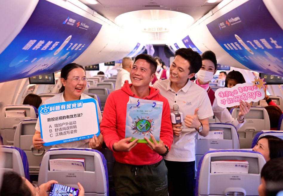 飞机进入平飞状态后,客舱变身为大型空中眼科保健课堂,两位援疆医生向乘客介绍眼科保健知识,乘客通过精心特制的眼镜,模拟体验不同眼部疾病的状况以及由此带来的不便,乘务组还介绍了“粤新光明行”的概况。机上科普活动提高了公众对眼睛的认知和理解,让更多人关注到身处西域边陲患有白内障等常见致盲眼病的患者。