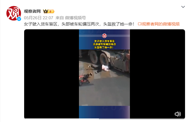 还有一位女子被大货车车轮连续碾压两次,幸亏戴了头盔,只受了轻伤,如果没戴头盔,后果不堪设想。