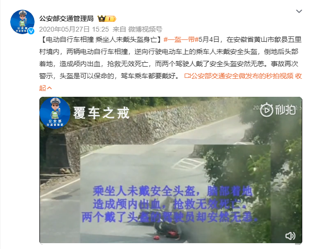 还有一个案例则不那么幸运,有两辆电动自行车相撞,其中戴头盔的两人完好无损,未戴头盔的人因为头撞到地上,伤重不幸去世。