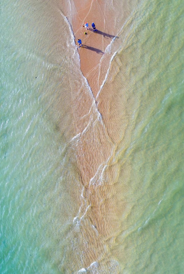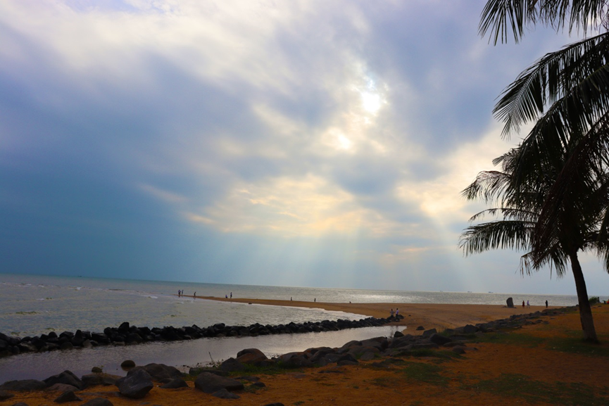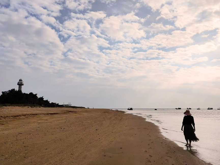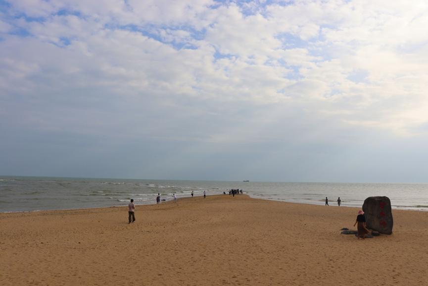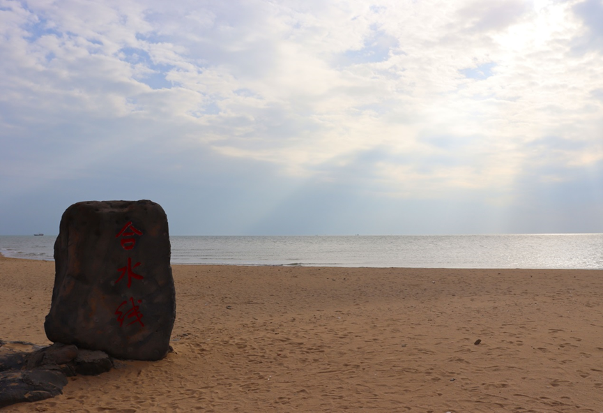 海滩合水线。它既是海洋与陆地交汇的地方,也是琼州海峡与北部湾的分界线。这个地方因其特殊的位置,形成了一条狭长的银色沙滩,被人们称之为“合水线”“爱的刻度线(北纬20°13'14)”。当潮起潮落时,这条沙滩会呈现出一种迷人浪漫的景象。