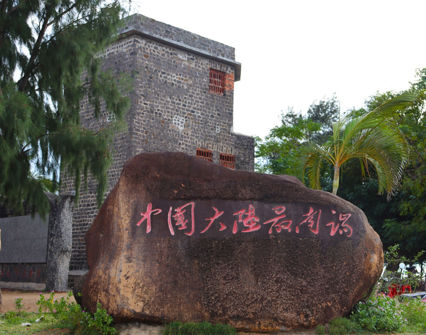 中国大陆最南端灯楼角,位于广东省湛江市徐闻县角尾乡,北纬20°13',东经109°55',距县城约38公里,被誉为“滘尾祥光”,是徐闻县著名的八景之一。灯楼角三面环海,有一角状沙滩前伸入海,伴着千亩盐田、珊瑚礁群,形成了一处美丽而独特的海滨风光。