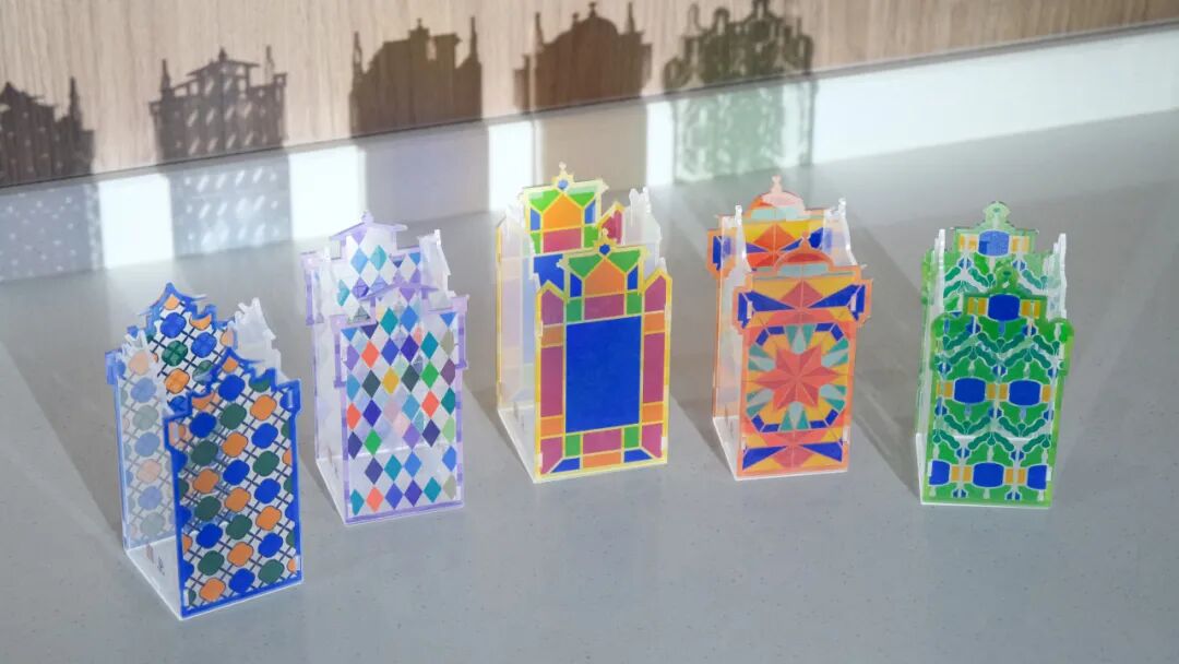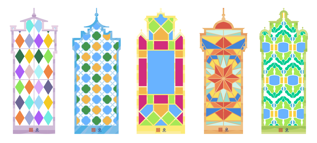 该设计元素采用了侨乡江门典型建筑——碉楼。设计师提取了开平不同碉楼形象,造型丰富且统一。在表面采用了满洲窗的样式和色彩。在光线照射下,产生瑰丽的色彩变化,十分迷人。