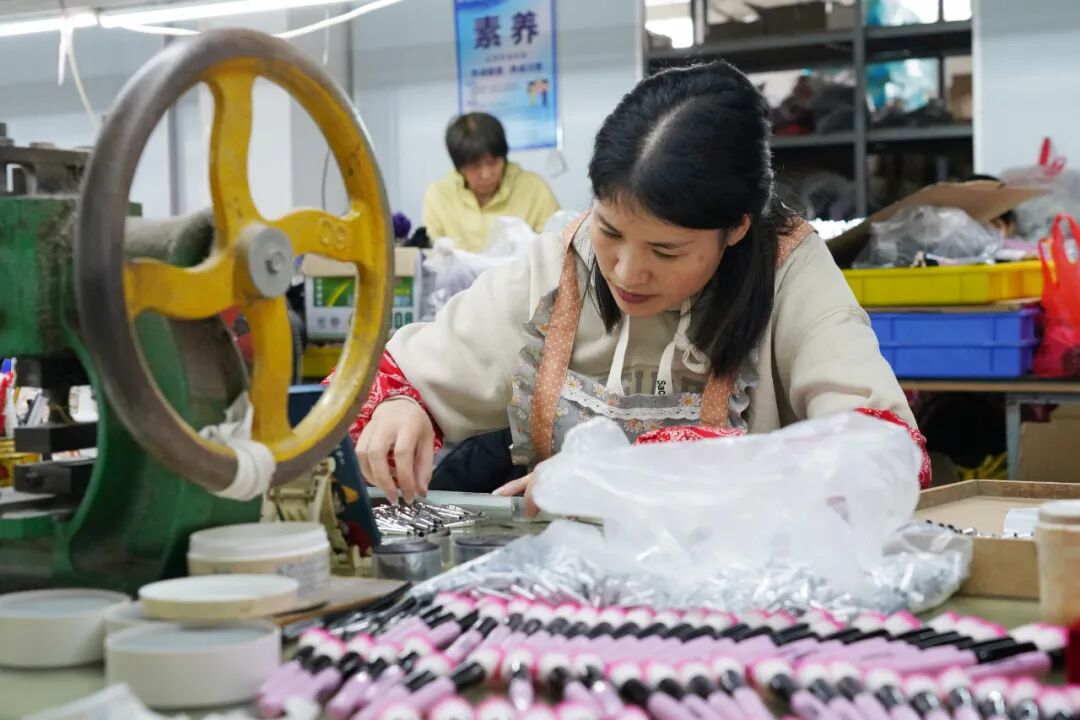 “眉笔是我们生产的化妆品之一,公司主要生产首饰锦盒、化妆用品、珠宝展示柜、照明灯具等,我们还是周大福主要供货商之一……”在罗定市欧领格实业有限公司的生产车间内,该公司总经理张百洪一边介绍公司的发展一边向记者展示公司的产品。欧领格公司位于罗定䓣塘产业园区内,成立于2018年,有独立电商部门以及完善的线上销售渠道,可通过亚马逊电商平台将产品销往海外,以“电商销售+工厂生产”模式带动䓣塘镇域经济发展,近两年的年产值均接近亿元,经济社会效益显著。