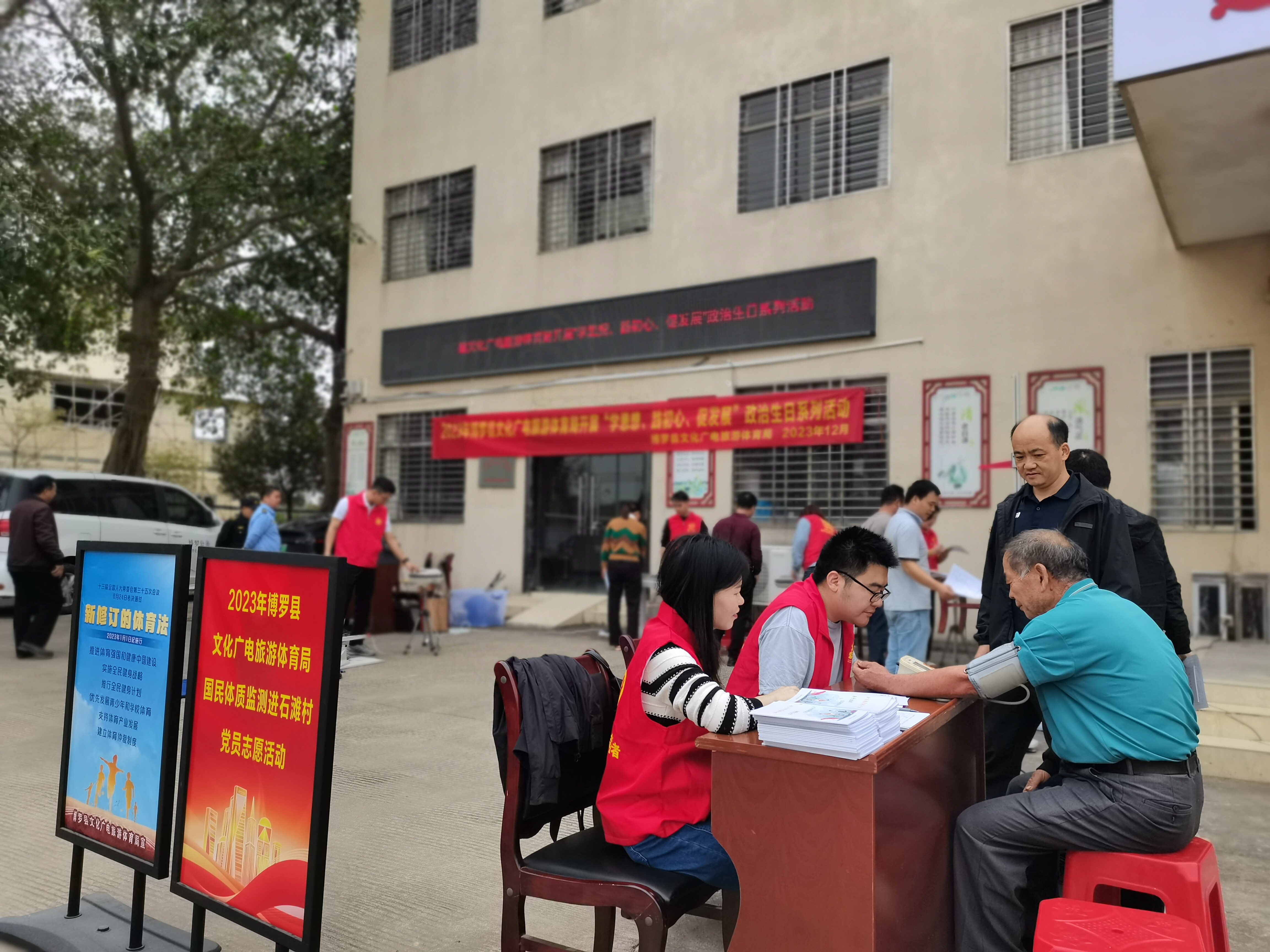12月14日,博罗县文化广电旅游体育局立足岗位特点,发挥行业优势,将国民体质监测与主题党日相结合,进入杨村镇石滩村开展国民体质监测党员志愿队服务活动。