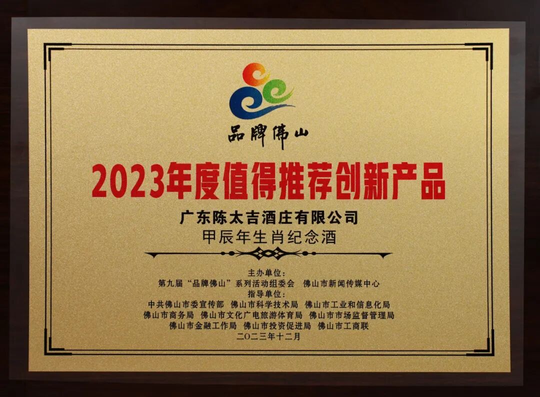在本次评选中,“陈太吉酒庄·甲辰年生肖纪念酒”从众多参评产品中脱颖而出,荣获“品牌佛山”2023年度值得推荐创新产品奖项。该产品酒体由陈太吉酒庄第七代庄主,非遗技艺传承人范绍辉领衔酿造,酒瓶由中国雕塑艺术大师李树旺设计,以远古龙图腾融合当代雕塑理念设计,产品融合“石湾酒”与“石湾陶”两大非遗技艺,不仅成为粤酒文创经典之作,也是佛山城市礼品的代表,推出市场以来已成为广大市民收藏送礼的重要选择。