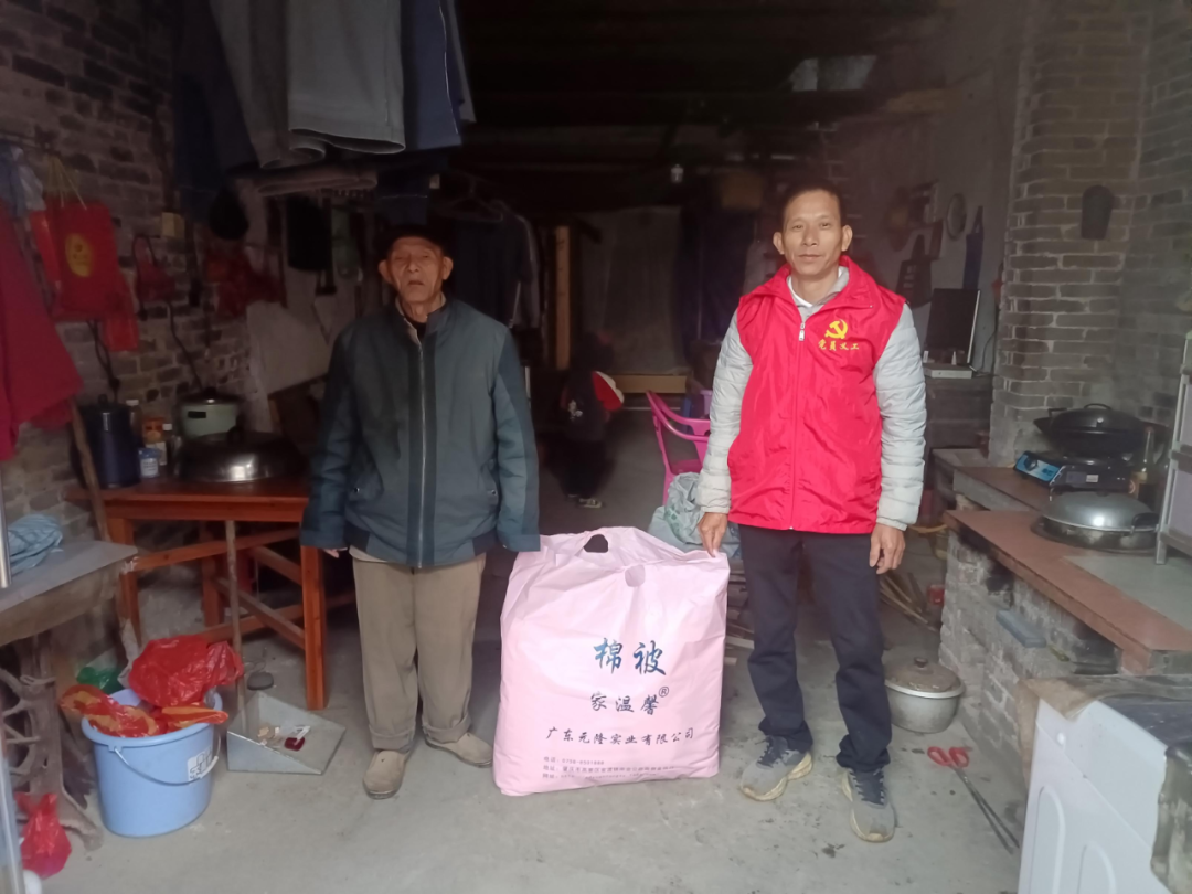 “老李,你自己一个人在家,现在天气又冷又下雨,你腿脚不灵活,不要随处走,我送你一张棉被,注意保暖......”邵国志在走访村中的老人家时细心叮嘱,并为他送上御寒物资。