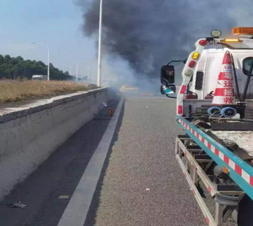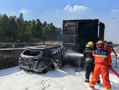 货车司机见状,马上启动货车,希望将货车与轿车分离,但由于两车粘合过紧,导致轿车被货车拖拽着前行,且发动机处有黑烟冒出。见此情形,身穿白色衣服的小伙子即时喝止了货车司机的行为,随即问过往行驶的车辆是否携带有灭火器,问了5辆车均回应未携带灭火器。小伙子随即回到马先生的车后备箱找到了一瓶简易灭火器,准备喷射时,却发现车辆发动机处黑烟加剧且伴随有火苗,见到事态不妙,小伙子当即放下手中灭火器,对马先生说:“发动机里面已经开始着火,用灭火器肯定起不到什么效果,现在要赶紧将你爱人抬出来才行。”小伙子又喊上后面追尾马先生车的司机帮忙,三个人合力将马太太从车里挪出来。小伙子抱着马太太迅速小跑到车后10米处的安全地带把她放在地上,不到1分钟,小车及货车起火燃烧。转瞬间,白色的轿车变成了一堆焦黑的废铁框架。