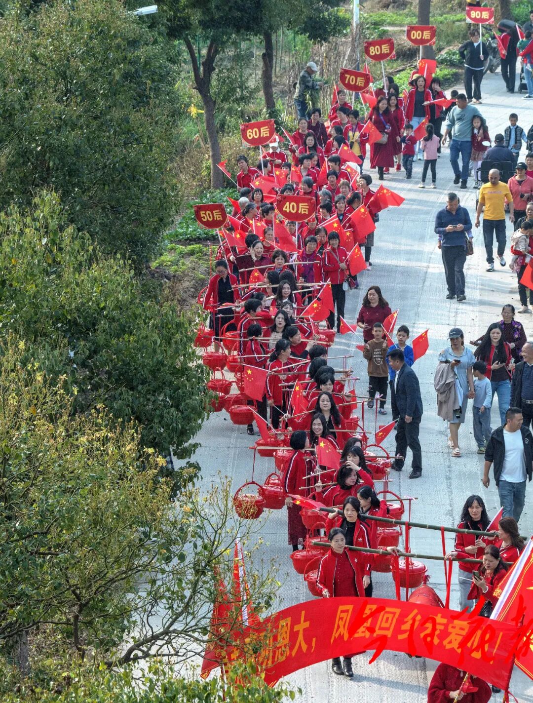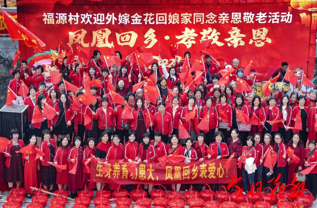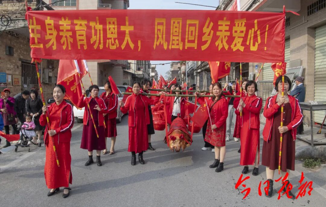 热情的父老乡亲点响了花炮,敲锣打鼓,用醒狮队热烈欢迎外嫁的女儿们回娘家,“娘家人”早早就在门前迎候,浓浓乡情亲情溢于言表。