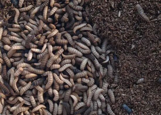 这些小肉虫就是黑水虻的幼虫,别看它们小小的不起眼,它们吃进去的是厨余,排出来可是肥料呢。将厨余垃圾进行粉碎、切割,变成一个个小颗粒,再加入菌种、干燥剂,进行菌落和湿度的调解,就变成了黑水虻幼虫的饲料。黑水牤吃掉这些饲料,排出的粪便经过堆肥,便可以制成有机肥料。据统计,100克、约4万~5万只黑水虻幼虫,在7~10天,就可以无害化处理1吨的厨余垃圾。此外黑水虻体内的蛋白质和脂肪酸的含量十分高,是很好的饲料原料,而将黑水虻幼虫烘干后,也可提取昆虫蛋白、昆虫油脂,真可谓是个宝藏小虫。