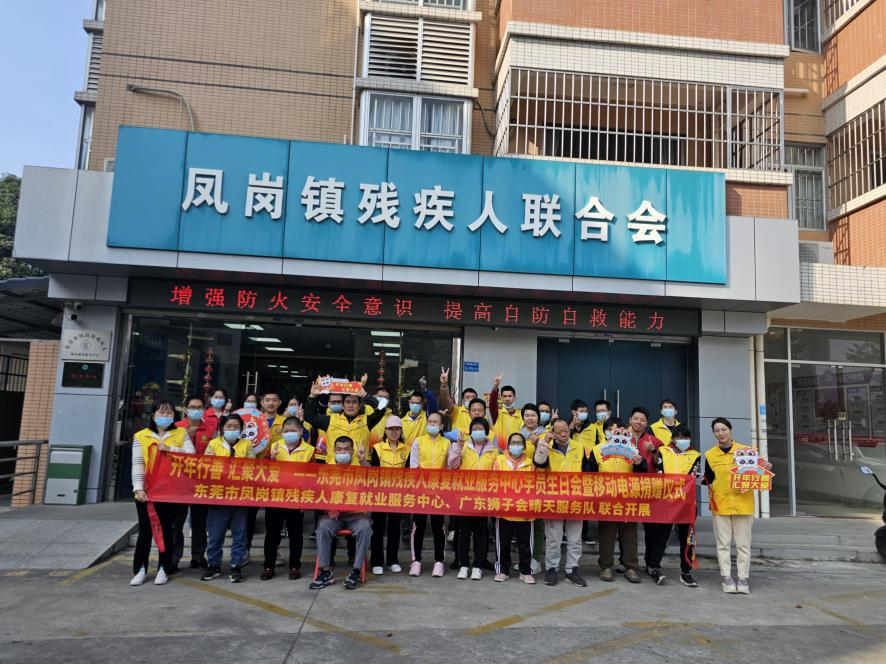 1月12日上午,广东狮子会晴天服务队在东莞市凤岗镇残疾人康复就业服务中心举办了一场主题为"开年行善 汇聚大爱"的关爱活动,向凤岗康就中心捐赠移动电源一台并为2024年第一季度生日学员庆生。