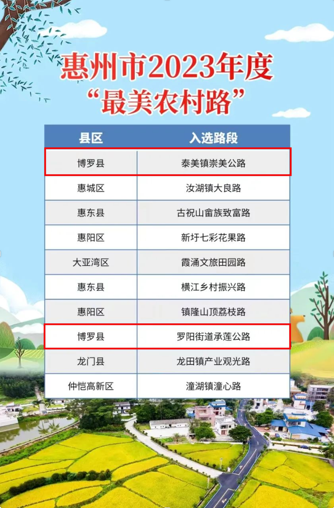 日前,市交通运输局、市公路事务中心公布了惠州市2023年度“最美农村路”名单,博罗县泰美镇崇美公路、罗阳街道承莲公路等10条农村公路上榜。一起来看具体名单~