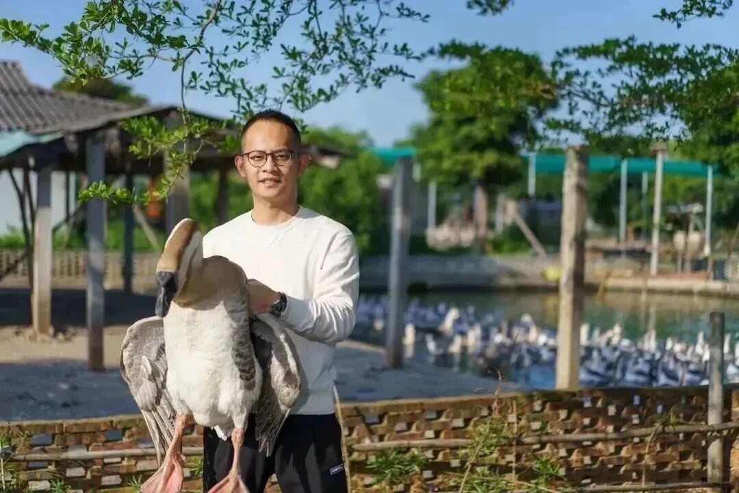 作为团支部书记、返乡大学生杰出代表,金书涛深耕狮头鹅产业,从种鹅饲养、鹅苗孵化、肉鹅饲养、屠宰加工及门店前端销售等环节着手,努力钻研,同时还与腾讯、深圳大学联合研究出“AI养鹅”小程序,2023 年被评为“汕头市最美科技工作者”,是养出“澄海最大狮头鹅王”的“90后”新农人。