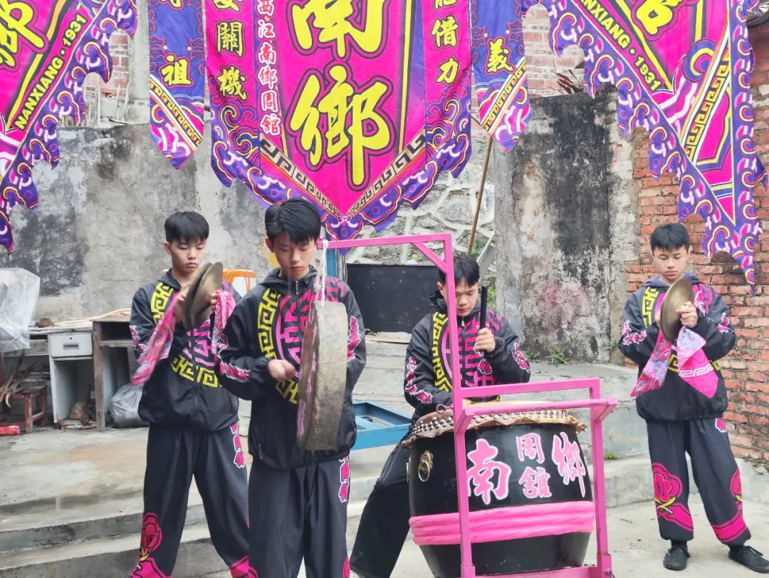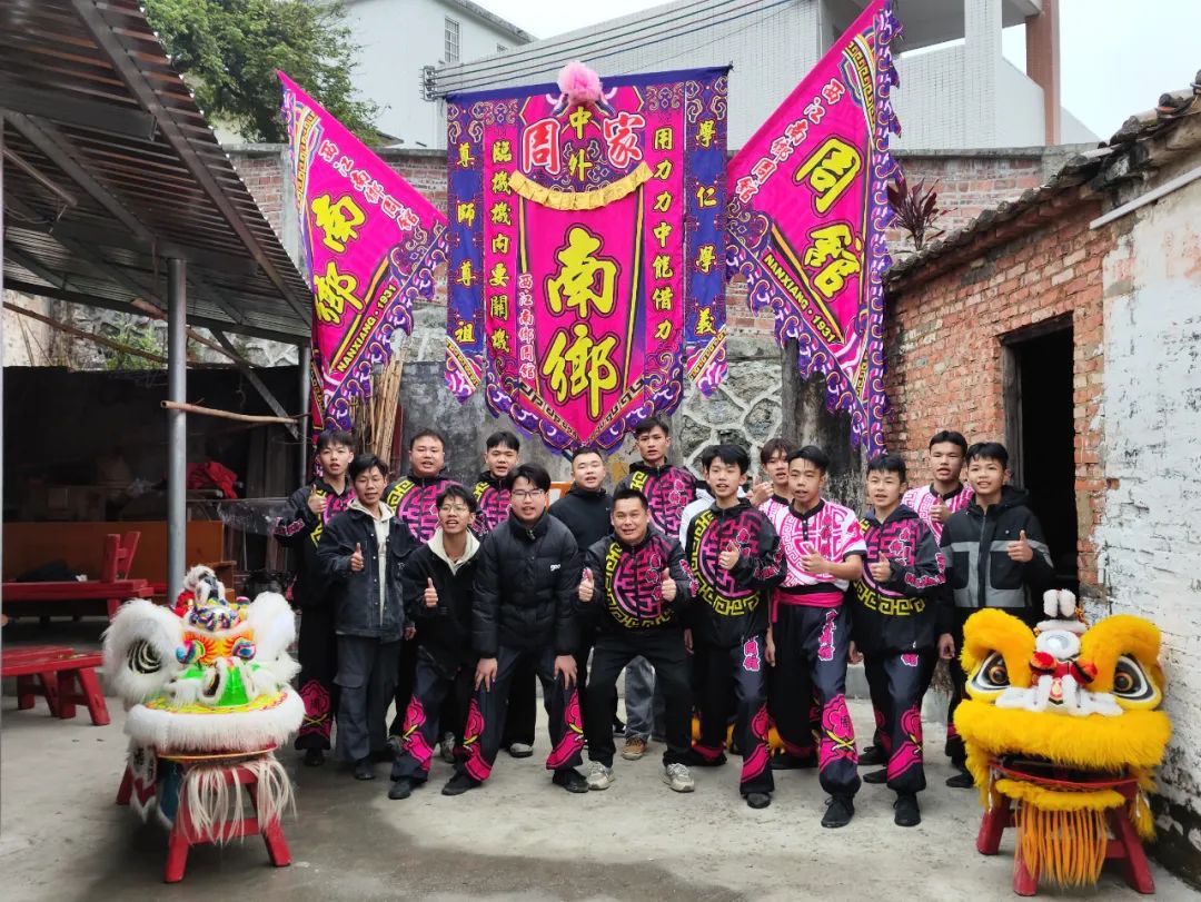 在六都镇南乡文体广场,教练为学员讲解武术和醒狮的起源、寓意、背景等知识,现场示范并“手把手”指导学员练习每套拳法的基础动作、锣鼓的节奏技法、狮子的姿态造型等。学员们认真对照学习,不断调整和完善,精准把握一招一式,力求将表演做到极致。