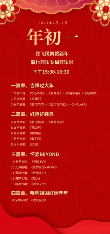音乐会分《吉祥过大年》《好运好经典》《怀恋BEYOND》《唱响祖国好运年年》四个篇章。来自江门本土的优秀音乐人齐聚一堂,倾情演绎了《财神到》《新春颂》《祝福你》等十分应景的贺年“神曲”,以及《喜欢你》《红日》《光辉岁月》《海阔天空》等脍炙人口的粤语流行金曲。演员们富有感染力的歌声点燃了观众的热情,现场掌声、喝彩声不断。演出最后,一首《歌唱祖国》更是引发全场大合唱,铿锵动人的旋律响彻广场,将现场气氛推向了最高潮。