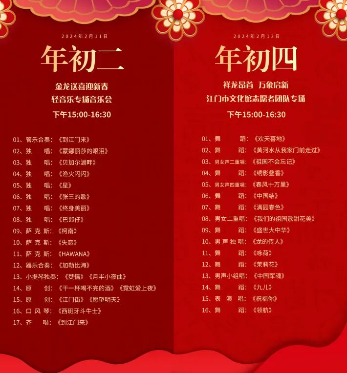 错过了这场演出的市民游客也不要遗憾,春节期间,长堤青年广场好戏连台,2月11日(大年初二)、2月13日(大年初四)、2月14日(大年初五),“金龙送喜迎新春——轻音乐专场音乐会”“祥龙昂首 万象启新——江门市文化馆文化志愿者团队专场”“龙腾狮舞贺新春——江门市龙狮巡游暨2024年江门市龙狮武术邀请赛”将轮番上演,让您度过一个缤纷多彩的“文化中国年”。