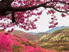 沿着蜿蜒的山路前行,热烈盛开的樱花映入眼帘,灿若红霞的红樱俏立枝头,构成了一幅如梦如幻的春日画卷。虽然最近气温不高,但漫山遍野的樱花带来了盎然的春意。春风拂过,带起落英缤纷,更是另一番美景。