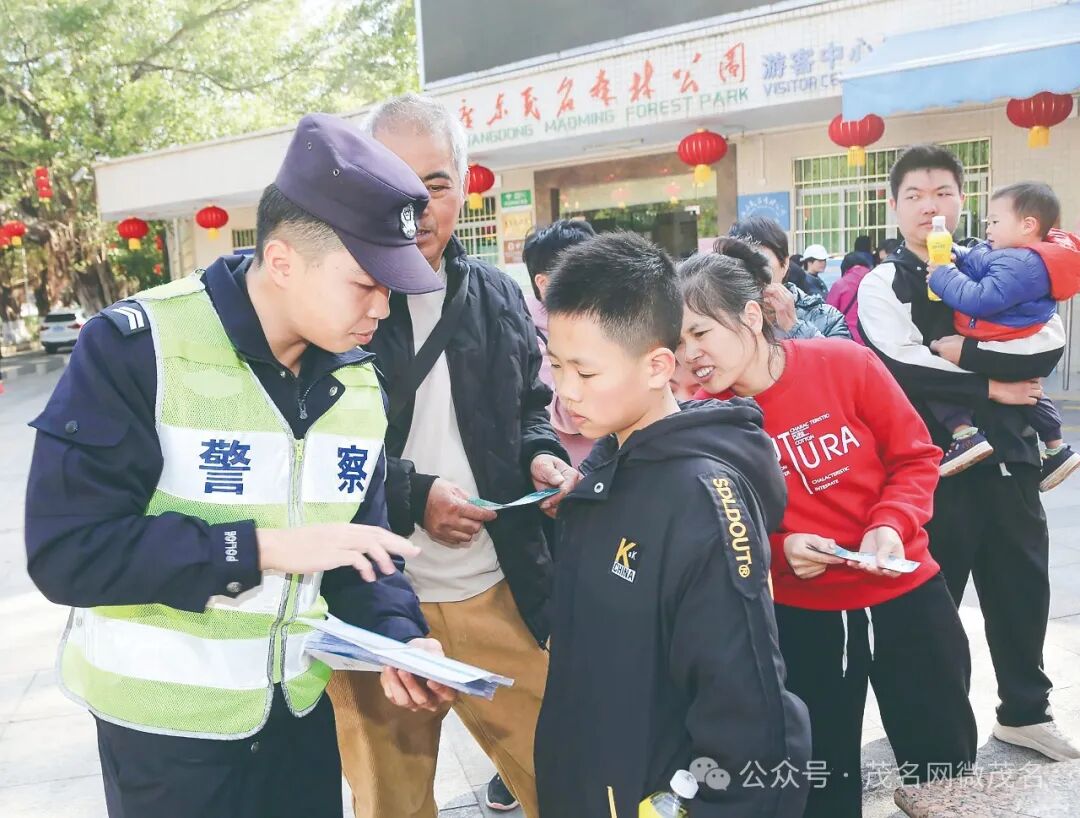 交警向游客派发交通安全宣传单张。茂名日报社全媒体记者 李颜东 摄