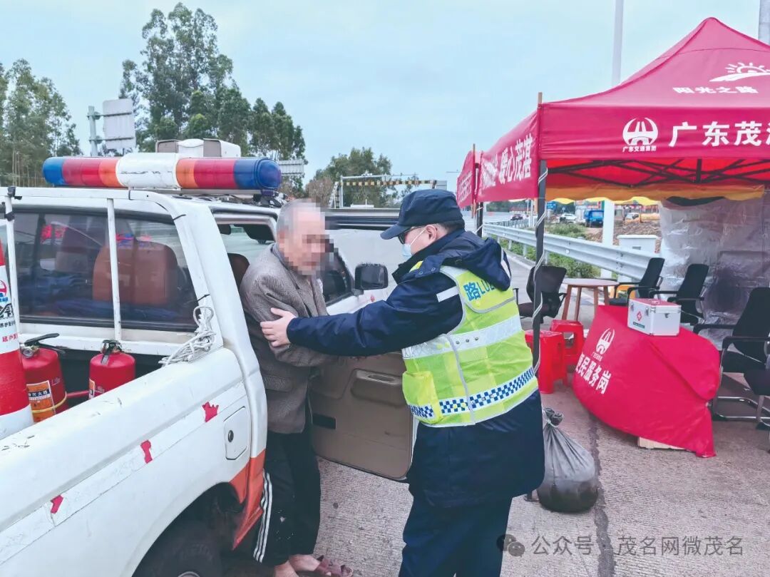 茂湛、包茂“高速人”显担当,春节坚守岗位温暖公众出行路。图为在茂湛高速浅水站出口外广场,路政员朱永灏小心搀扶迷路老人下车。通讯员 魏勇 摄