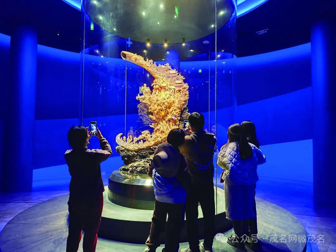 窦州墟内的中国牙雕艺术馆春节“不打烊”,与市民群众一起共贺新年,为大家的新春餐桌增添一道文化佳肴。图为市民观赏镇馆之宝《天地颂》。茂名日报社全媒体记者 蔡林琳 摄