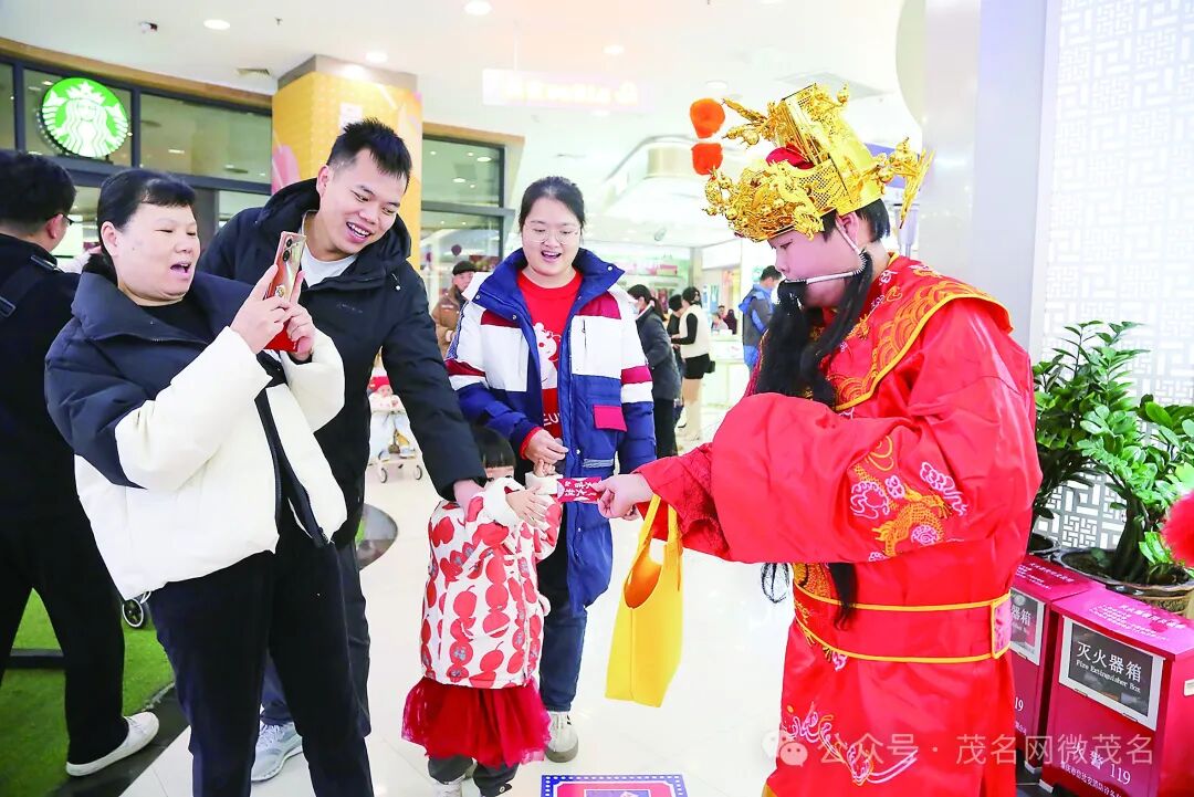 大年初一,在市区印象汇商场内,一名工作人员化身“财神爷”向市民派送新年“利是”。 茂名日报社全媒体记者 岑稳 摄