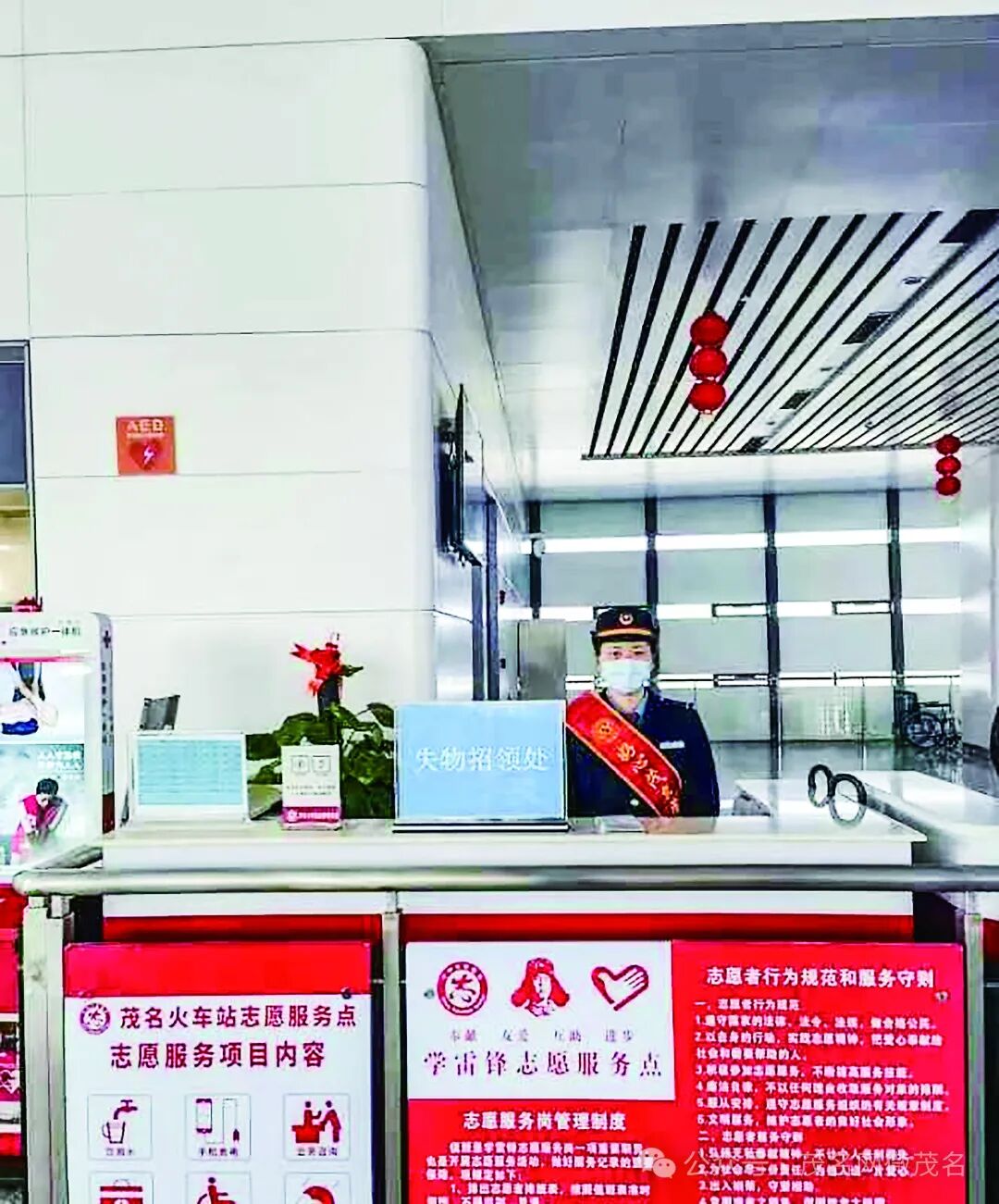 今年春运期间,茂名站为营造“温馨出行,平安春运”的浓厚氛围,在“好心茂名”党员服务岗设立“爱心药箱”,向广大旅客免费提供应急外用药和旅客出行常用物品;在南北两个检票口处摆放好轮椅、担架以及盲杖;在候车大厅里额外增设“充电吧台”和“好心书吧”,为广大旅客提供免费充电服务和阅读空间。图为“好心茂名”党员服务岗。通讯员 李波 郑博远 摄