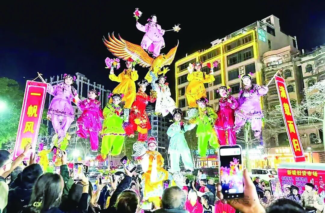 年初五晚,信宜窦州里文化创意街外,非遗巡游升级加强版飘色、舞龙加六双花灯,将年味氛围拉足。图为飘色巡游。通讯员 高干 摄