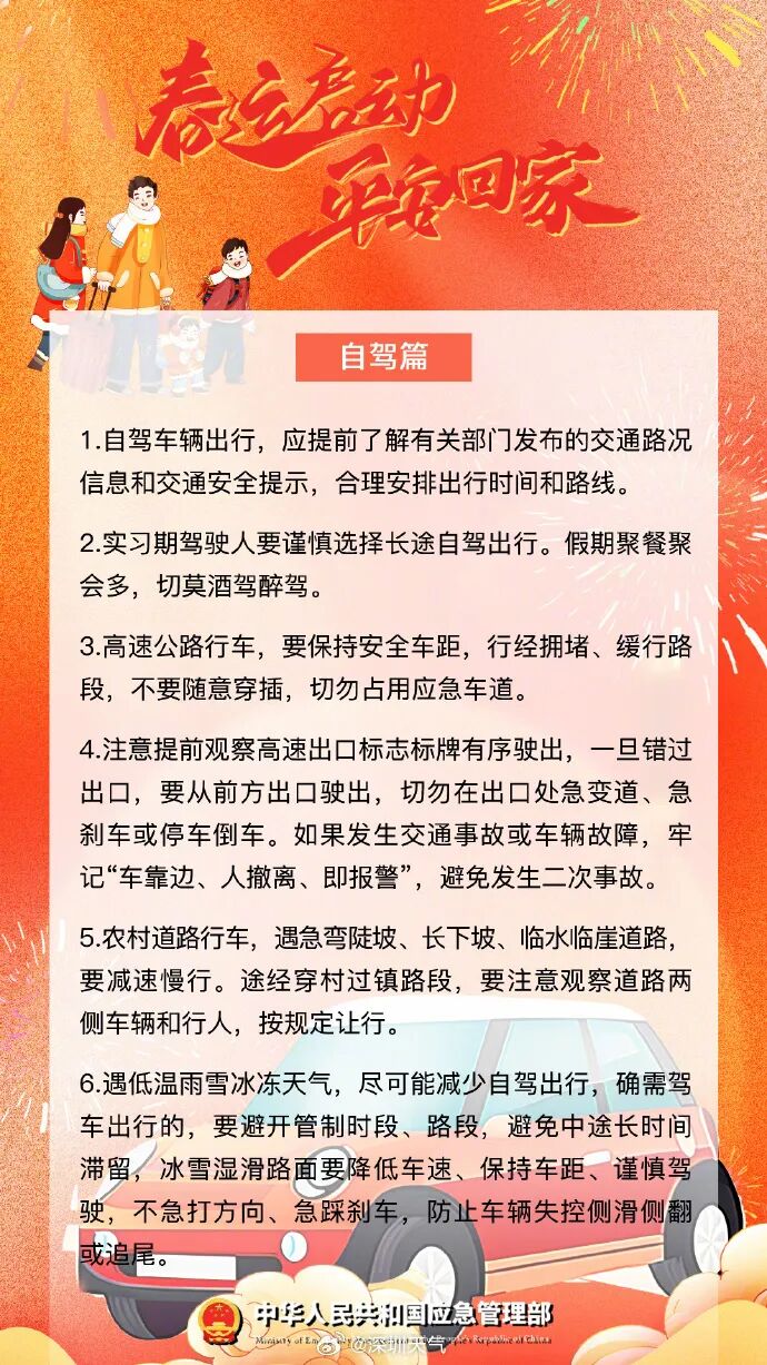 目前已进入春节假期返程高峰期,归途中请时刻把安全放在第一位,切勿疲劳驾驶、酒后开车、超员超载等