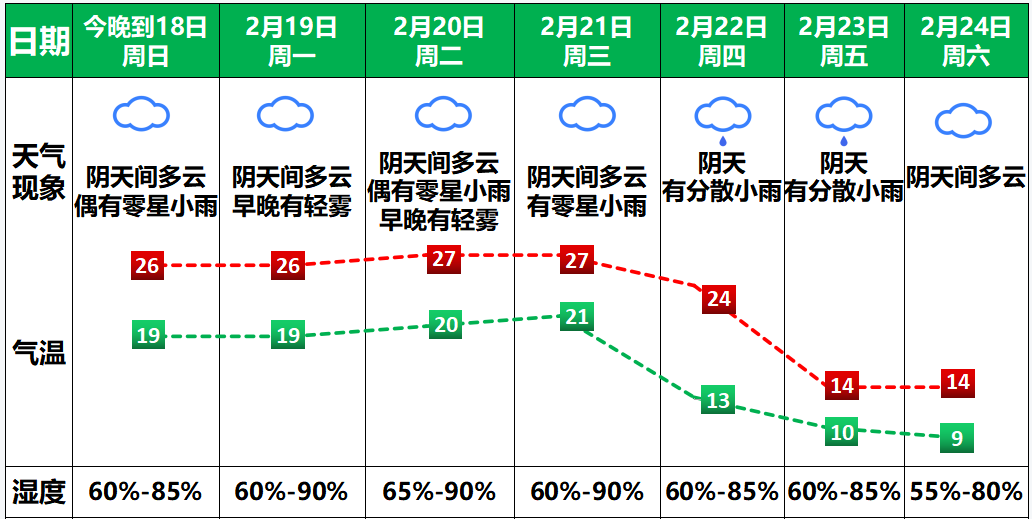 总体较暖湿,阴天为主,偶有弱降水,夜间至早晨,能见度转差有轻雾或雾,22至24日,受强冷空气持续影响