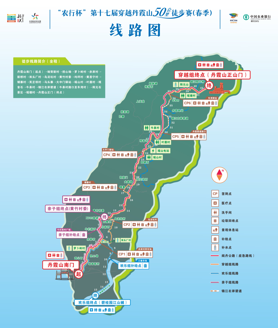 活动具体路线:丹霞山南门(起点)→坳背新村→罗卜岭村→赤岸村→双头厂村→三雄农场→碧桂园江山樾(终点)