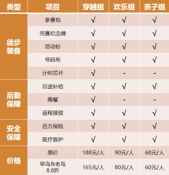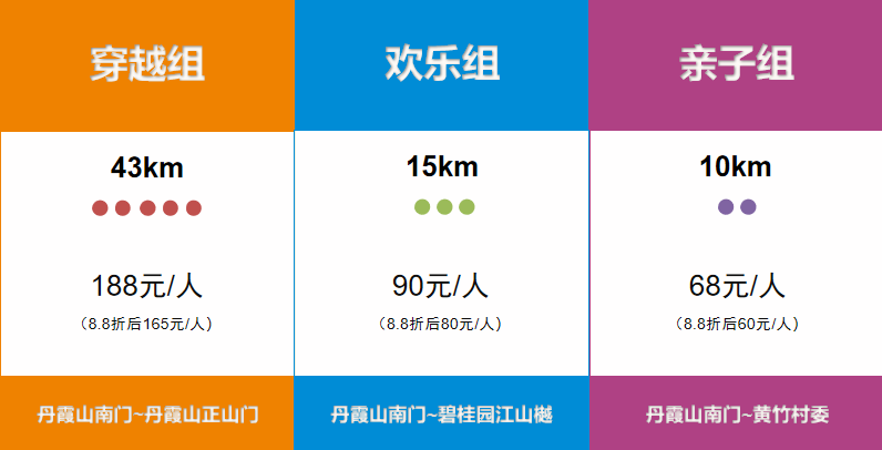 赛事组别:穿越组(43km)、欢乐组(15km)、亲子组(10km)