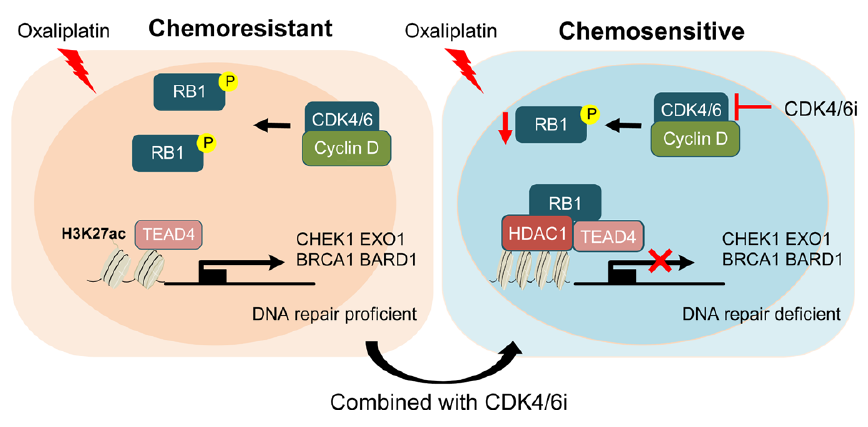 最后,通过整合分析RNA-seq和ChIP-seq数据,CDK4/6抑制剂通过表观遗传修饰调控RB1-TEAD4信号轴影响同源重组修复相关基因的表达,从而逆转奥沙利铂耐药现象(图5)。