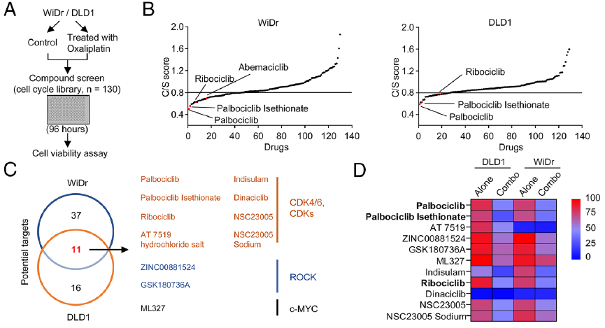 为了寻找治疗靶点,研究团队使用小分子抑制剂文库进行高通量药物筛选,发现CDK4/6抑制剂可以显著提高奥沙利铂药效(图4)。