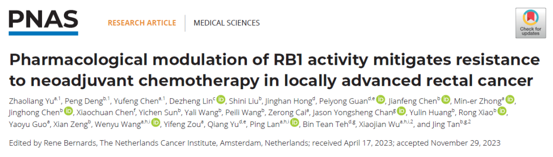 对于局部晚期的直肠癌,目前主要采用新辅助治疗降低肿瘤分期以改善治疗效果,但是有相当一部分的患者对新辅助化疗耐药,预后极差。因此,深入探索直肠癌对新辅助化疗耐药的分子机制,有利于发现新的治疗靶点,开发新的治疗方案。近日,我院吴小剑、余照亮课题组与中山大学肿瘤防治中心谭静课题组在美国国家科学院院刊PNAS上发表了题为:Pharmacological modulation of RB1 activity mitigates resistance to neoadjuvant chemotherapy in locally advanced rectal cancer的研究论文。研究团队通过描绘新辅助化疗耐药型直肠癌的肿瘤分子特征, 结合高通量药筛筛选,发现CDK4/6抑制剂可以有效提高奥沙利铂疗效,进一步利用多组学测序技术(全转录组测序和表观遗传组测序等)揭示了当中的分子机制,为新辅助化疗耐药的直肠癌患者提供了新的治疗思路。