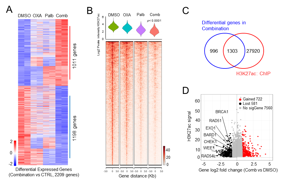新辅助化疗是目前临床上治疗局部晚期直肠癌的主要手段,但是约30%-60%的直肠癌患者对目前新辅助化疗方案不敏感,肿瘤退缩较小或者甚至不退缩,然而临床上又缺乏更多的药物治疗选择,这群患者的术后辅助治疗多是继续沿用一线的化疗方案,预后极差。为了探索肠癌新辅助化疗耐药的肿瘤分子特征,研究团队首先收集了结直肠癌肿瘤组织进行转录组测序,再跟踪随访病人化疗效果,根据疗效把病人分为化疗敏感型和耐药型,进行分组分析。结果发现耐药型肿瘤组织中细胞周期相关的信号异常活化,提示以“靶向异常的细胞周期检查点”寻找治疗靶点可能可以逆转化疗耐药。于是进一步利用小分子抑制剂文库进行高通量筛选,发现CDK4/6抑制剂可以有效提高奥沙利铂敏感性,并且可以协同抑制肿瘤细胞增殖。机制上,通过整合全转录组测序分析和染色质共沉淀测序分析发现CDK4/6抑制剂通过影响表观遗传修饰调控同源重组修复相关基因的表达,从而解释了CDK4/6抑制剂为何可以逆转奥沙利铂耐药现象的机制,该研究有望为新辅助化疗耐药的直肠癌患者提供新的用药选择(图2)。