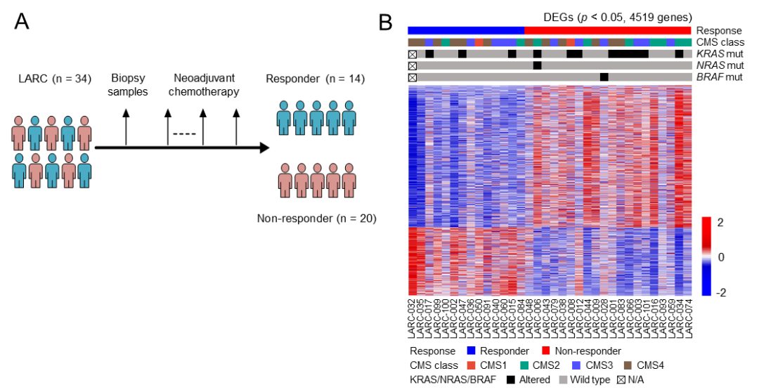 研究团队通过收集34例新辅助治疗前的局部进展期直肠癌患者肿瘤样本,根据新辅助治疗后手术切除的肿瘤样本病理切片进行肿瘤退缩评价(Tumor regression grade,TRG),对病人进行分类,并分析耐药相关的肿瘤分子特征(图3)。