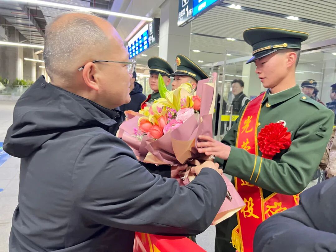 3月1日中午,由镇、村(社区)退役军人服务中心(站)和退役士兵家属组成的“退役返乡欢迎团”,冒着严寒天气,前往东莞南站安全迎回3名首批春季返乡退役士兵。迎接现场气氛热烈,一束束鲜花、一声声欢迎光荣回家、一个个热情的拥抱,让退役士兵一出站就感受到家乡的热情和“温度”。