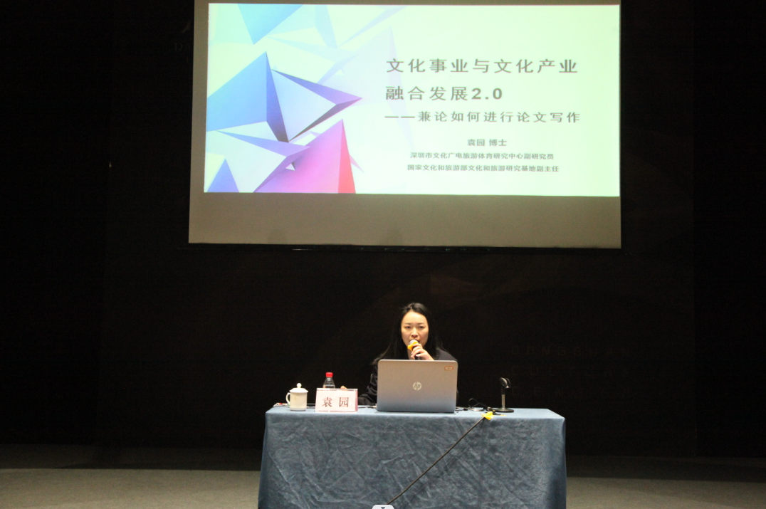 讲座邀请了深圳市文化广电旅游体育研究中心副研究员袁园担任授课老师,袁老师以《文化事业与文化产业融合发展——兼论如何进行论文写作》为题,从“论文写作方法”及“文化事业与文化产业的融合发展”两个方面展开授课。