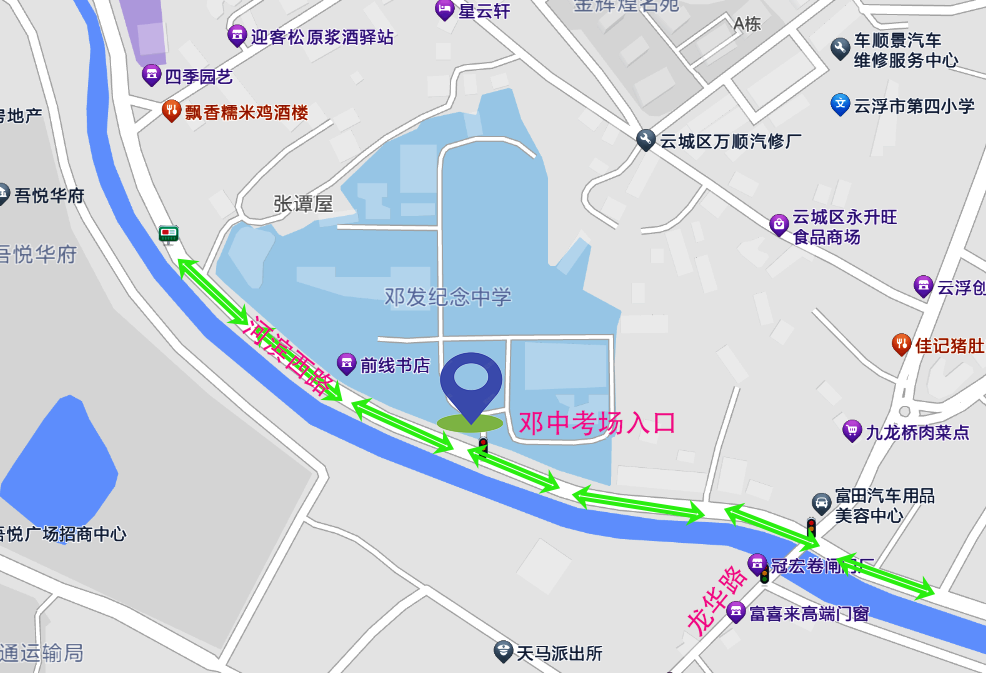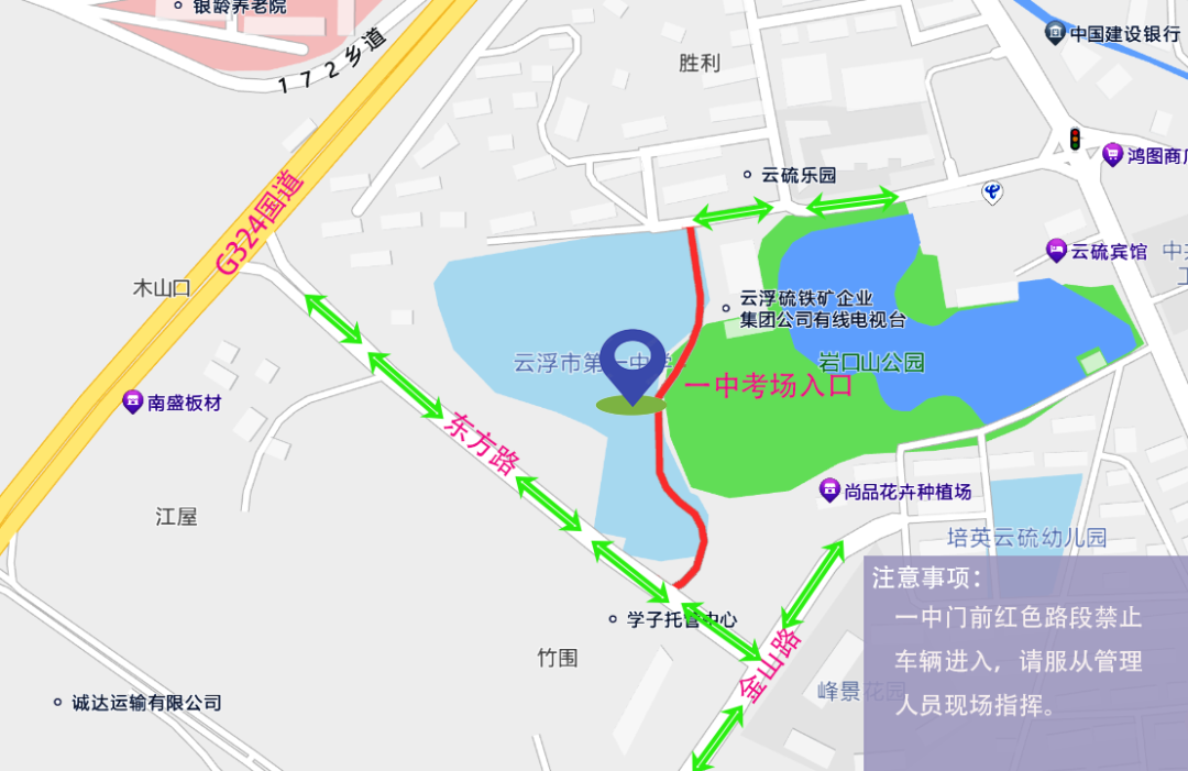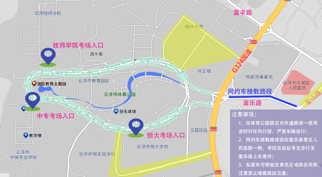 云浮市教育园区、邓发纪念中学、云浮中学(新校区)、云浮市第一中学(罗桂桥校区)周边路段实施临时交通管制,考点周边车辆禁鸣喇叭。除执行任务的警车、消防车、救护车、工程抢险车及安保、电力、通讯、工作保障车辆外,其他车辆请按现场执勤人员指挥通行。