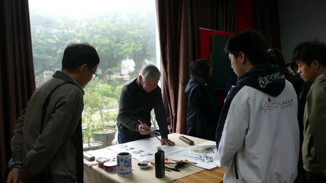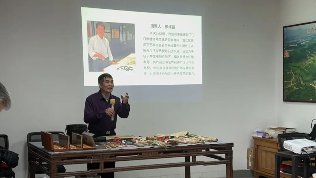 活动伊始,张成富老师先向参与者详细介绍了白沙茅龙笔的历史渊源和制作工艺。白沙茅龙笔起源于明代,由大儒陈白沙先生始创,他用江门圭峰山上特有的茅草作为材料,创制了这种独特的笔。茅龙笔制作技艺十分繁琐,每一道工序都凝聚着匠人的心血和智慧。通过老师的讲解,参与者们对茅龙笔有了更加深入的了解,也对其背后的传统文化产生了浓厚的兴趣。