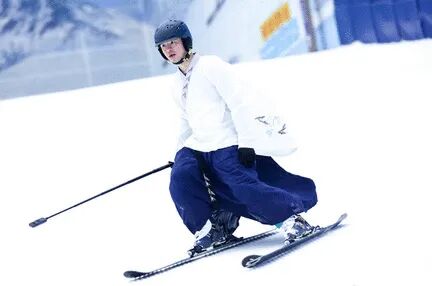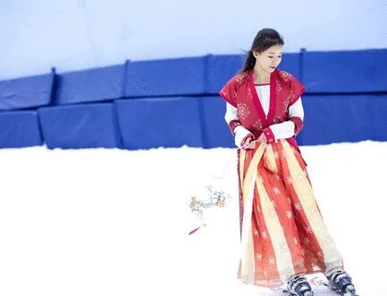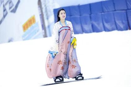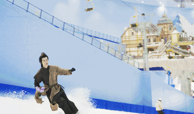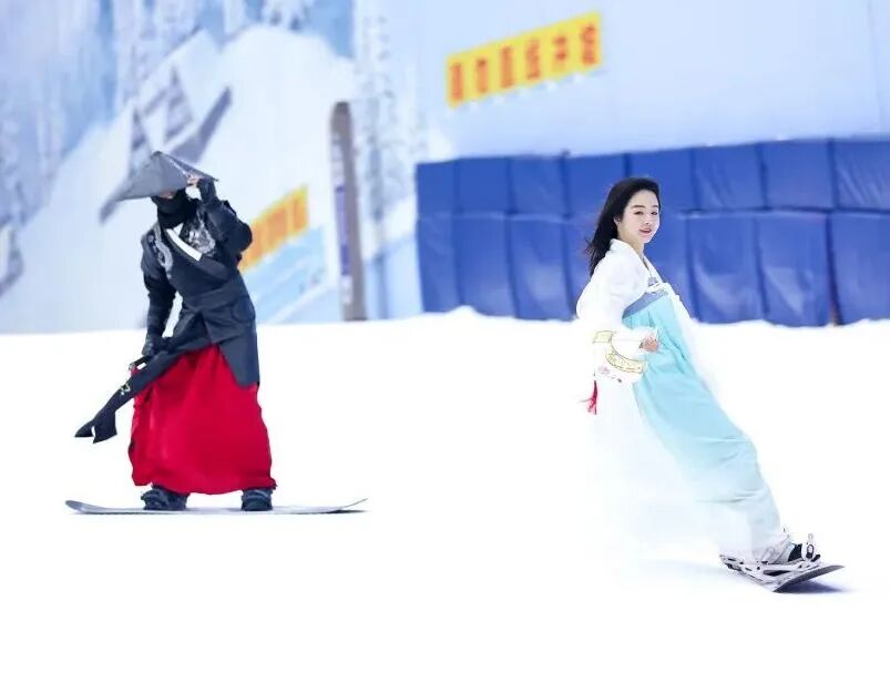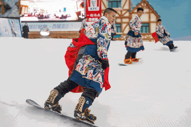 盛装打扮的男女花神,脚踩滑板在雪地上炫技,呈现出一场春花与冬雪的视觉碰撞