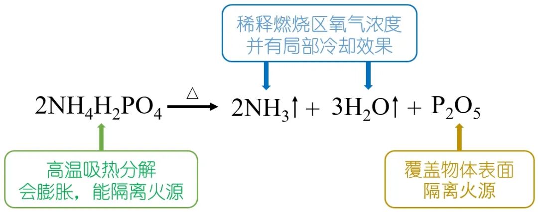 磷酸二氢铵受热后会形成阻断燃烧的链式反应,从而达到“化学抑制”的效果;其分解产物(氨气和水蒸气)可以稀释火场的氧气浓度,从而达到“窒息灭火”的效果。