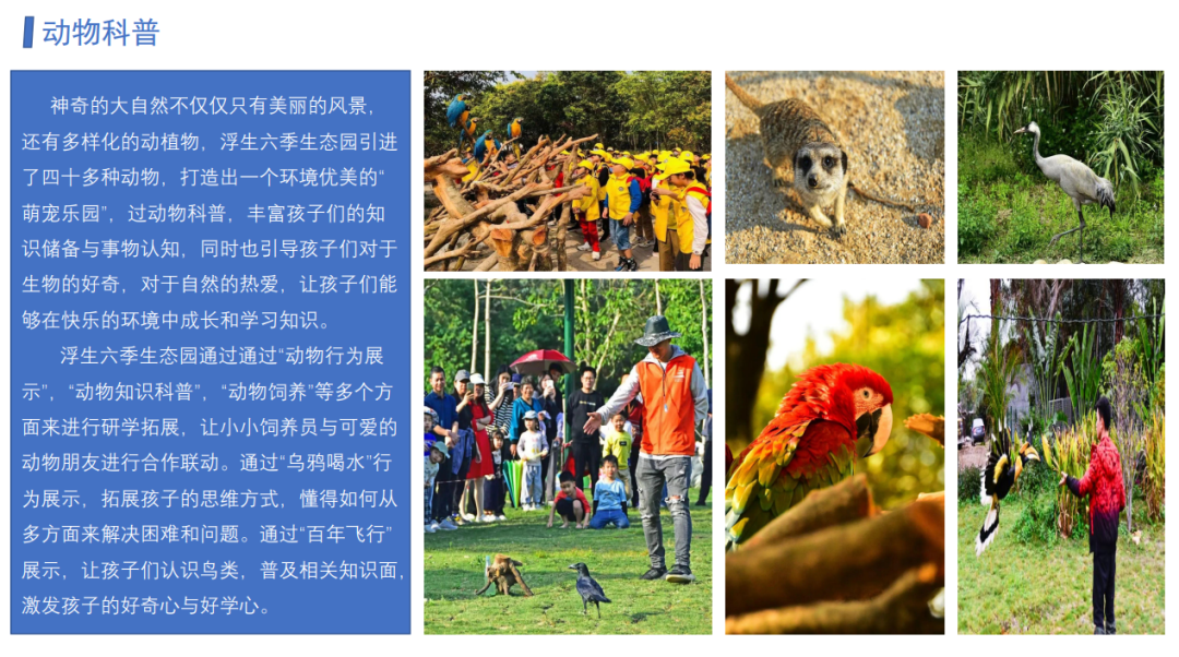 生态园以百花季、萌宠季、 亲水季、丰收季、露营季、狂欢季作为活动主题,结合“农耕文化”“动物科普”“自然课堂”开展研学实践、团建拓展、亲子互动等项目。