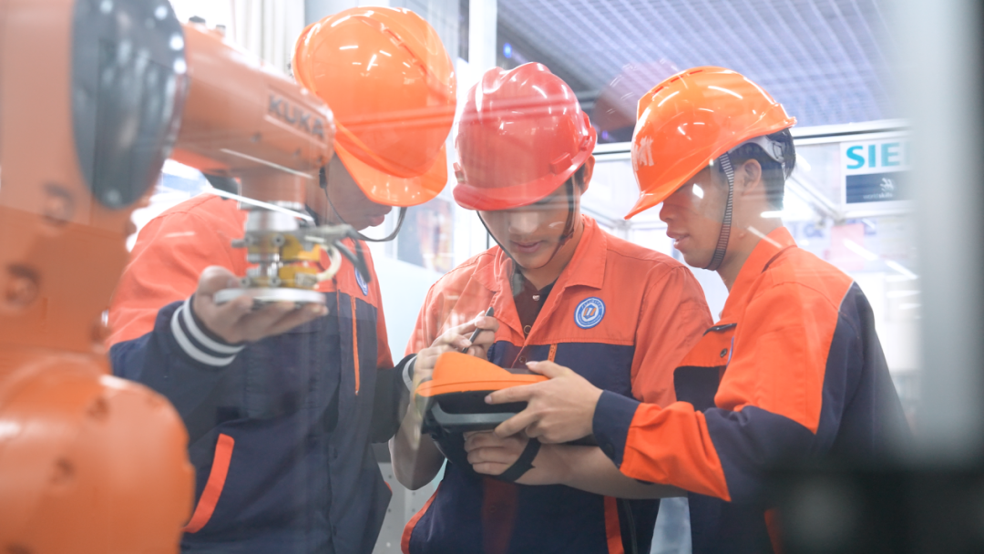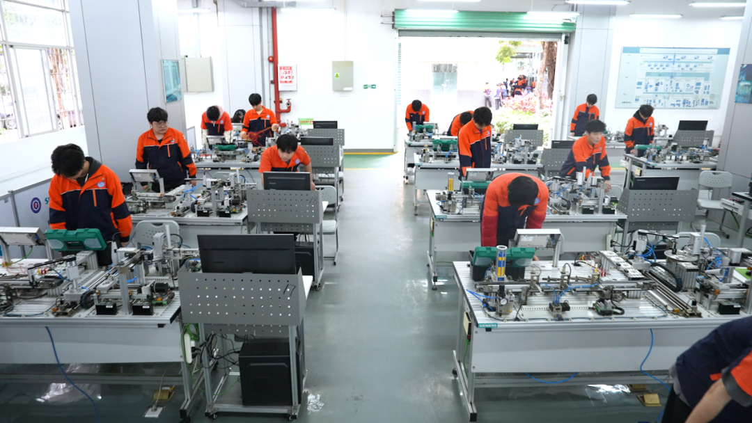 据程国仙介绍,国际学院的实训基地与西门子公司、库卡机器人公司合作共建共创,所学内容包括PLC控制技术、变频驱动技术、机器人控制技术、人机界面控制等课程。“教学内容都是结合企业中现场的教学案例,或者现场工程实践方案来实施的。”