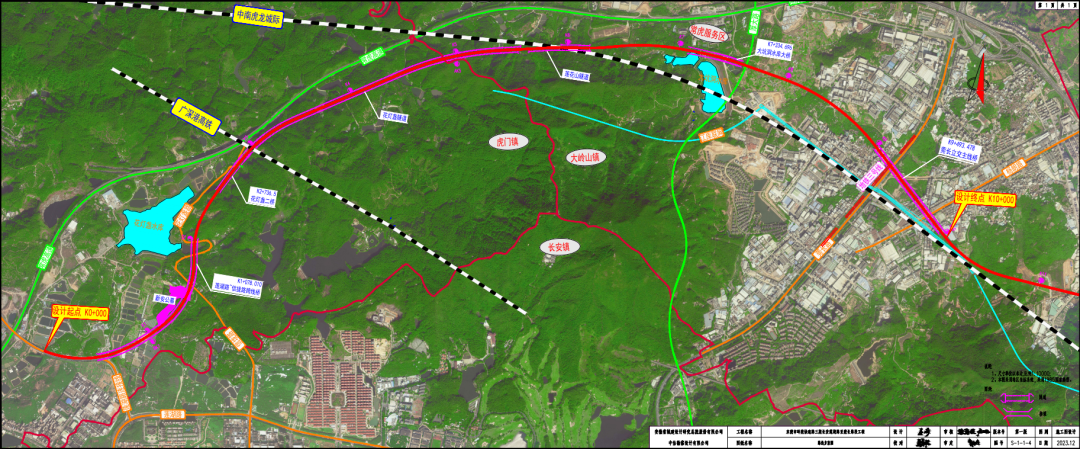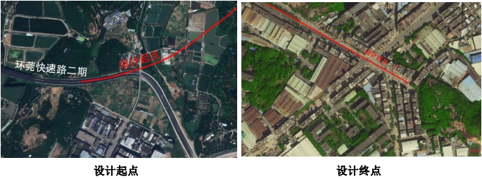 本项目位路线起于环莞二期终点,经过虎门镇,本项目于常虎高速与广深港高铁交叉处南侧下穿广深港高铁,穿越高铁后,采用隧道形式穿越大岭山,进入大岭山镇经过颜屋村后终于莞长路。