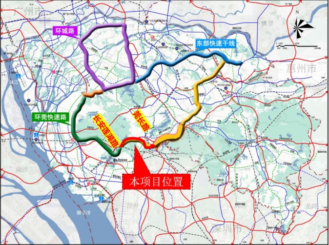本项目是环莞快速路三期工程的重要组成部分,从长安莲湖路连接线至莞长路,呈东西走向,全长约 10 公里(莞长路至龙大高速段后期单独立项)。项目建成后将与环莞快速路三期工程的另外两段(即龙大高速至莞深高速段、莞深高速至东部快速路段)一起,实现东莞市域快速路网的环形闭合。