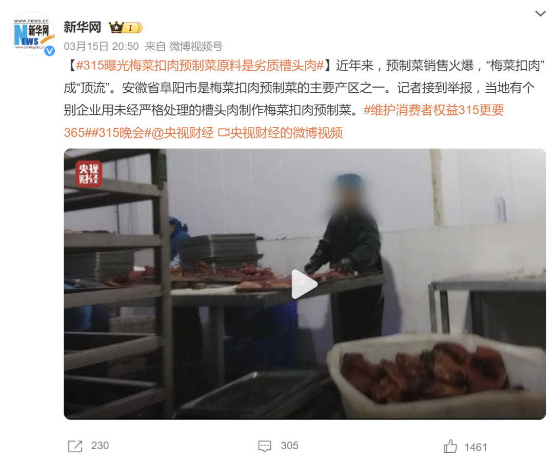 每年的315晚会尤其热闹,也许今年就有人吃着淀粉肠看着直播,美滋滋,突然,口里的淀粉肠就不香了,又想起冰箱里还有几袋梅菜扣肉,看看视频,再看看肠,欲哭无泪啊!哀报!打工人的心头好淀粉肠塌房,方便快捷的预制菜梅菜扣肉翻车!