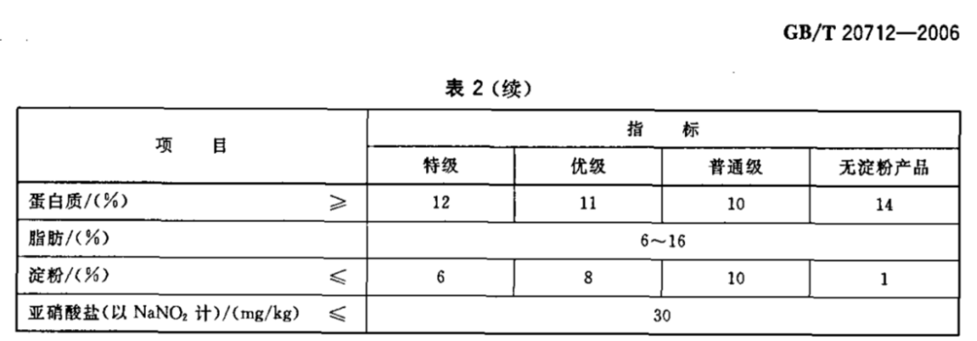 火腿肠的国家标准《GB-T20712-2006》还在有效期内,但是即将被《GB/T20712-2022火腿肠质量通则》给代替。在现行标准中规定普通级、优级、特级和无淀粉火腿肠的蛋白质含量分别不得低于10%、11%、12%、14%;淀粉分别低于10%、8%、6%和1%。和即将更新的国标对比特级、普通级、优级火腿肠蛋白质含量和淀粉含量要求没有什么特殊变动。
